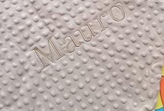 Primero, la mantita, en un color camel muy bonito, no he conseguido que salga bien en la foto. No quise que el nombre destacase mucho y traté de ponerle un tono muy parecido al de la manta.