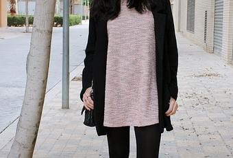 El vestido es de un tono rosa palo combinado con negro, así que decidí combinarlo con el resto del look en prendas negras.