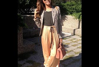 ¡Hola a todos!Aquí vuelvo con otro outfit de veranito veranito y con más 'maxi' prendas. En este caso he rescatado de mi armario estos maxi trousers del año pasado que son de raso color nude y se atan con un cordón a la cintura. ¡No me pueden gustar más tanto por lo cómodos que son como por lo que estilizan la figura!Los he combinado con camiseta gris con detalles de cristal y colores en los hombros, bolso en rosa palo y sandalia plana con cristalitos también en rosa nude. Para primera hora de la mañana y para por la noche cogí una chaqueta corta plateada mezclada con rosa palo.