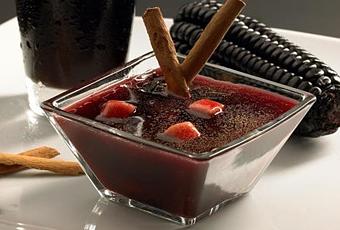 Preparación: Hervir en una olla por 5 minutos la chicha morada, los troncos del membrillo, manzana, clavo y canela entera. Luego cuele la chicha, Picar la manzana y membrillo en cuadraditos y con el azúcar hacer un almíbar con un poco de chicha y agregarle a la olla. Disolver el chuño en la 1/2 taza restante de chicha. Agregar el chuño disuelto a la chicha hirviendo sin dejar de remover y cocine el chuño por dos minutos más. Apagar el fuego y dejar reposar.