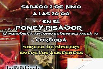 El Poney Pisador esta situado en la calle Periodista Antonio Rodríguez Mesa, número 15, de Córdoba. Esta es su pagina de FB. En el evento se van a sortear blisters de figuras entre los asistentes. La hora es un poco peculiar para hacer una presentación, al menos para mi, acostumbrado a ir a presentaciones y eventos de este tipo mas bien hacía media tarde, aunque supongo será por temas de horarios de apertura del local.