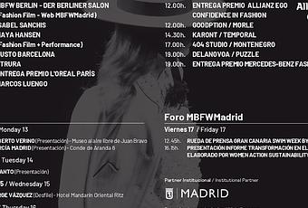 Una edición más, MBFWMadrid contará con un atrayente programa OFF que se desarrollará en los días previos y durante la pasarela. Participan doce diseñadores del panorama nacional y sus desfiles y presentaciones se localizarán en distintos escenarios de la ciudad de Madrid.
