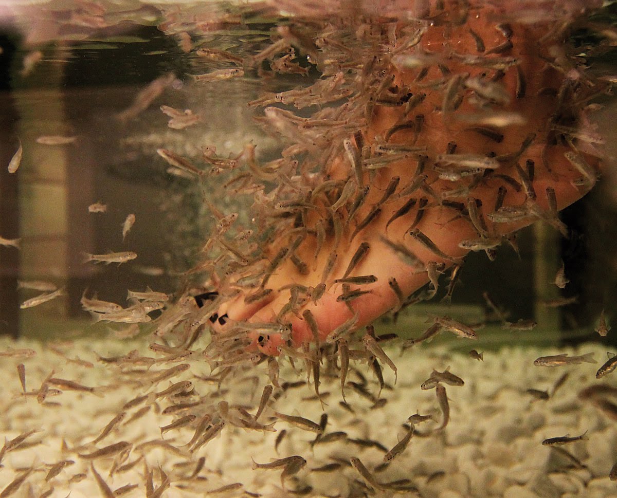 Os recomiendo que lo probéis. El tratamiento se llama Ictioterapia y consiste en dejar trabajar a los pequeños "Garra Rufa", cuya misión es comerse los tejidos muertos del cuerpo y ayudar a regenerar células nuevas en la piel, permitiendo así que las heridas se curen.