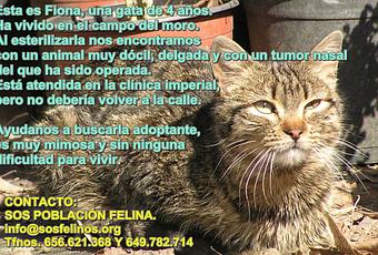 FIONA. GATA DE 4 AÑOS. HA VIVIDO EN EL CAMPO DEL MORO, EN LA CAPTURA PARA ESTERILIZAR NOS ENCONTRAMOS CON UN ANIMAL MUY DÓCIL, DELGADA Y CON UN TUMOR NASAL DEL QUE HA SIDO OPERADA. ESTÁ ATENDIDA EN LA CLÍNICA IMPERIAL PERO NO DEBERÍA VOLVER A LA CALLE. AYÚDANOS A BUSCARLA ADOPTANTE, ES MUY MIMOSA Y SIN NINGUNA DIFICULTAD PARA VIVIR.