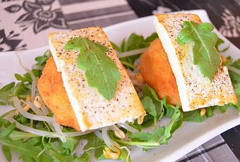 Emplatamos poniendo en el fondo la rúcula con los germinados, colocamos los medallones de patatas y encima el tofu. Decoramos con una hoja de rúcula y espolvoreamos con pimienta negra recién molida.