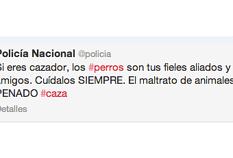 Y ahora un encontronazo con el twitter oficial de la @Policía que no venía absolutamente a cuento de nada. La gente de la @Policía sencillamente escribe un tweet para recomendar a la gente de los beneficios de los perros, dejando de soslayo una especie de aviso a los cazadores y a cualquier otro que pueda llegar a maltratar a los animales.