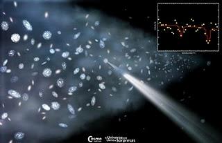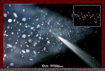 En esta impresión artística, se representa en primer plano la llamada "Pared del Escultor" (Sculptor Wall). Se muestran galaxias espiral y elípticas en la pared junto con el recientemente detectado gas intergaláctico, parte del llamado Medio Intergaláctico Caliente Templado (Warm Hot Intergalactic Medium, WHIM), que se muestra en azul. Este descubrimiento representa la evidencia más fuerte hasta ahora de que la "materia faltante" en el universo próximo se encuentra en una enorme red de gas caliente difuso.La emisión de rayos X desde el WHIM del muro es demasiado débil para que se pueda detectar, por eso se realizó, en cambio, una búsqueda de la absorción de luz que produce el WHIM sobre una fuente brillante en el fondo, por medio de observaciones profundas con el Observatorio de rayos X Chandra y el XMM-Newton. Esta fuente de fondo es un agujero negro supermasivo en rápido crecimiento situado mucho más allá de la pared, a una distancia de unos dos mil millones de años-luz. Se lo muestra en la ilustración como una fuente similar a una estrella, con su luz viajando a través del Muro del Escultor hacia la Tierra. Las ubicaciones relativas de la fuente de fondo, el Muro de Escultor y la galaxia Vía Láctea se muestran en el dibujo, donde el observador mira la fuente desde abajo y el muro arriba.