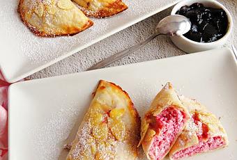 medias lunas, un delicioso postre ya que van rellenas de requesón, almendra y pasta de frambuesa.