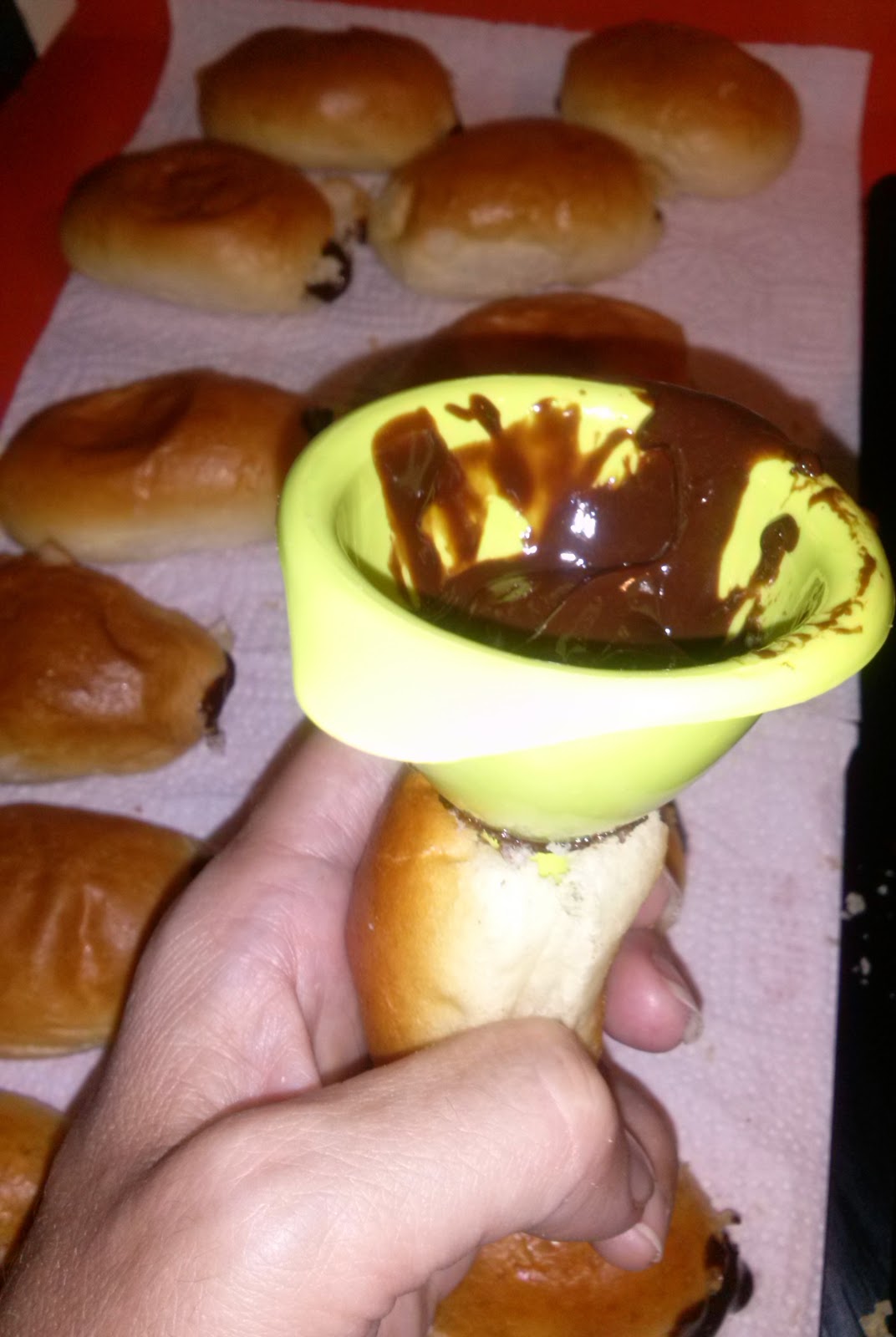 Haz un agujero en la parte de arriba de las medias noches y rellena con el chocolate ayudándote de un embudo.