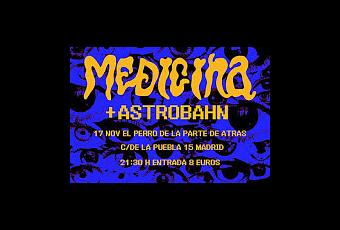 Medicina llega desde Algeciras con un puñado de grandes canciones que lucirán en el escenario de la céntrica sala de Madrid en la que no dejarán de sorprendernos. Astrobahn por su parte presentarán uno de los repertorios más potentes, elegantes y sinceros que se recuerdan y es que sus canciones dan un valor añadido a sus directos transportando a los asistentes a otro tipo de escenario.
