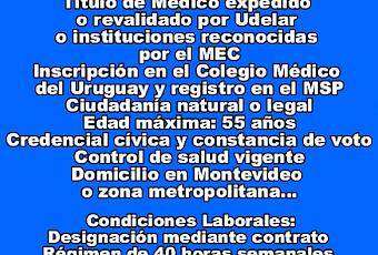 🎓 Requisitos ExcluyentesTítulo de Médico expedido o revalidado por Udelar o instituciones reconocidas por el MECInscripción en el Colegio Médico del Uruguay y registro en el MSPCiudadanía natural o legalEdad máxima: 55 años al cierre de la inscripciónCredencial cívica y constancia de votoControl de salud vigenteDomicilio en Montevideo o zona metropolitanaNo haber sido destituido de ningún organismo del EstadoDisponibilidad para viajar al interior del país