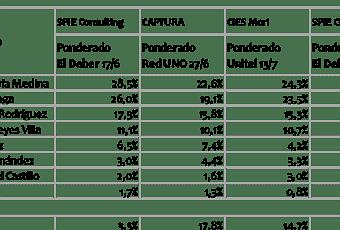 Si nos abocamos exclusivamente a las encuestas del mes de Julio y nos damos la licencia de promediar las últimas de UNITEL y El Deber, encontramos dos empates técnicos, considerando que ambas encuestas (la de CIES Mori para UNITEL y la de SPIE Consulting para El Deber) tienen similar margen de error del ± 2,2 %: Doria Medina y Quiroga quedan empatados en el primer cuartel y Rodríguez y Reyes Villa en un segundo (recordando que una encuesta es una fotografía del momento).