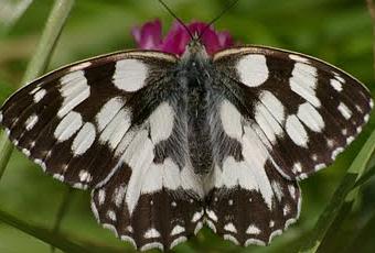Hoy no paran de revolotear unos cuantos individuos de mariposa Medioluto Norteña (Melanargia galathea).