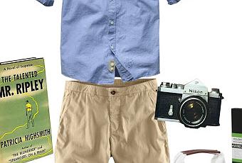 1.- Camisa de Scotch & Soda2.- Bermudas de H&M3.- Gafas modelo Wayfarer de Ray-Ban4.- Mocasines de Mango5.- Bolsa de Hackett6.-Libreta viajes ciudad Venecia de Moleskine7.- Libro "The talented Mr. Ripley"8.- Camara vintage de Nikon