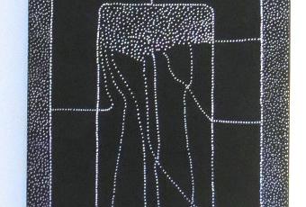 Todo empieza con un reciclaje de un bastidor. Fondo de pintura de pizarra negra. Después, dibujo unos rectángulos, siguiendo una muesca que ha quedado del anterior y decido que lo llenaré todo, todo de puntitos blancos. Sé que es mejor situarlos separados pero…no puedo evitar apelotonar los puntitos…Error.