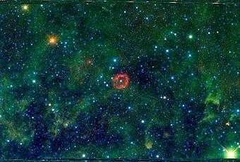 El material es expulsado en forma de envueltas de gas como la que brilla intensamente en esta imagen de WISE. En este caso, esta esfera de gas hueca se presentó sólo de forma prominente en sólo una de las cuatro longitudes de onda infrarroja detectadas por WISE. Los astrónomos especulan que esta luz infrarroja procede de los átomos de oxígeno, que han sido despojados de algunos de sus electrones por la radiación ultravioleta de la estrella. Cuando los electrones se unen de nuevo con los átomos de oxígeno, la luz que emite se puede detectar en la longitud de onda de 22 micrones en el infrarrojo. El proceso es similar a lo que ocurre en las bombillas fluorescentes.