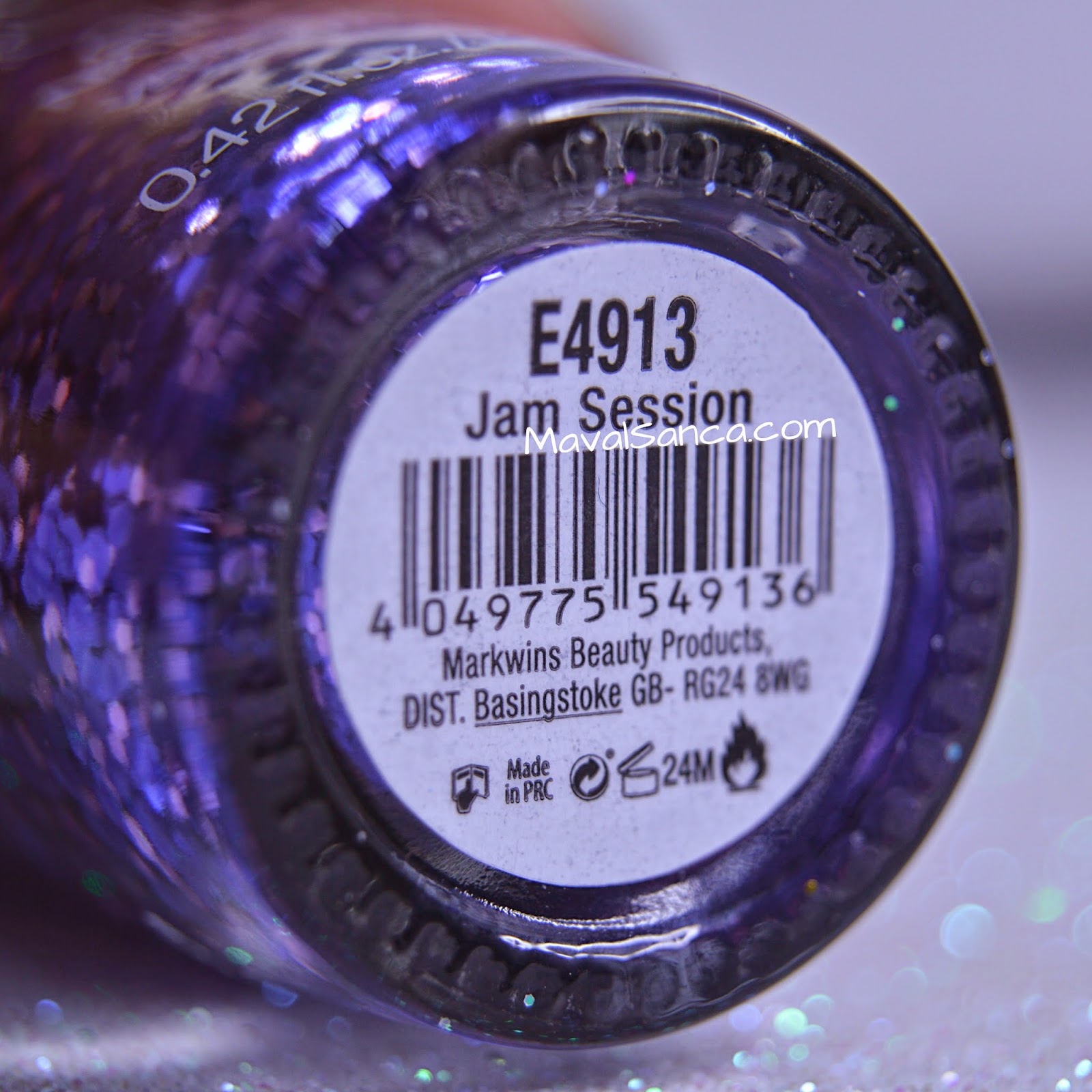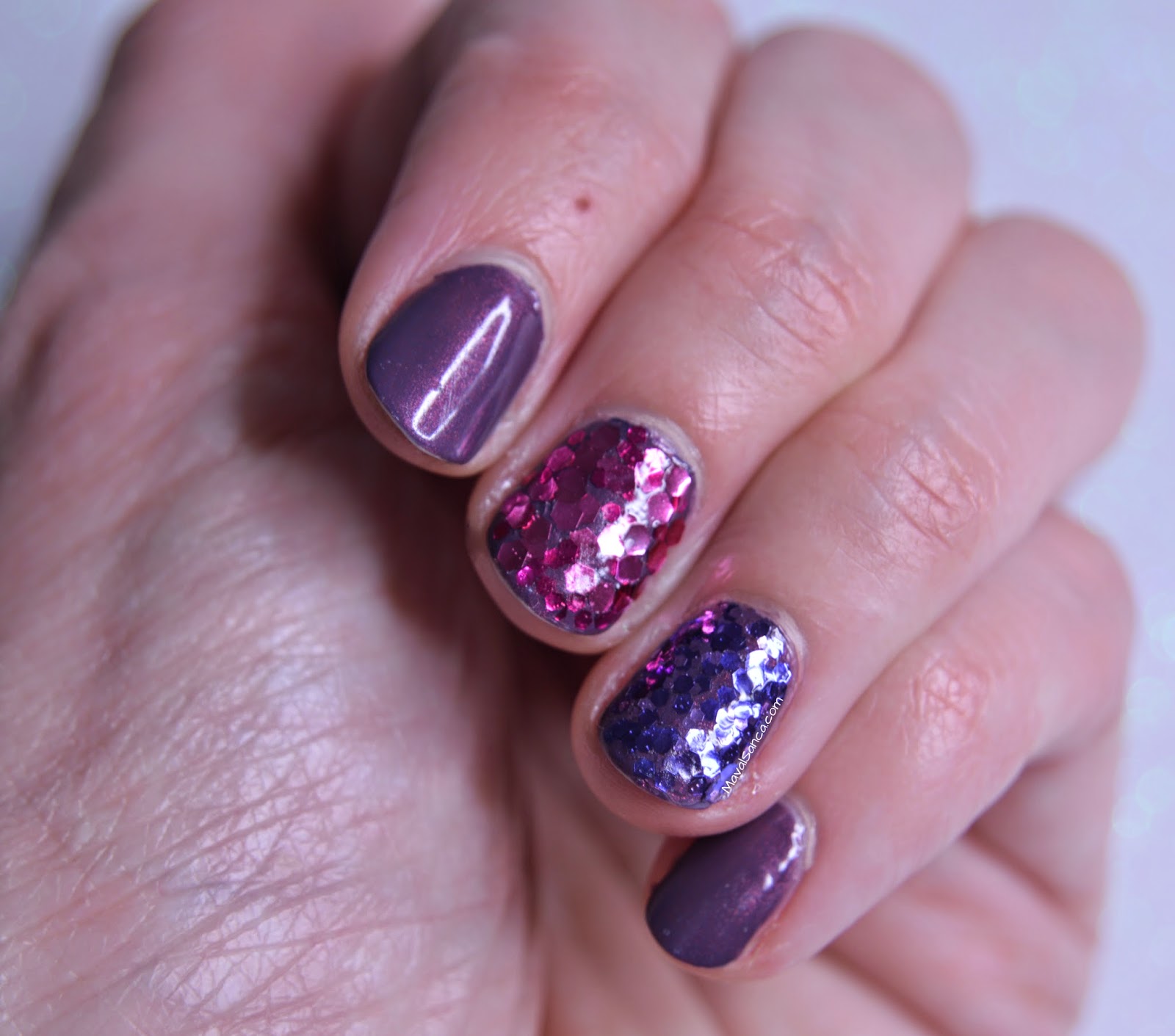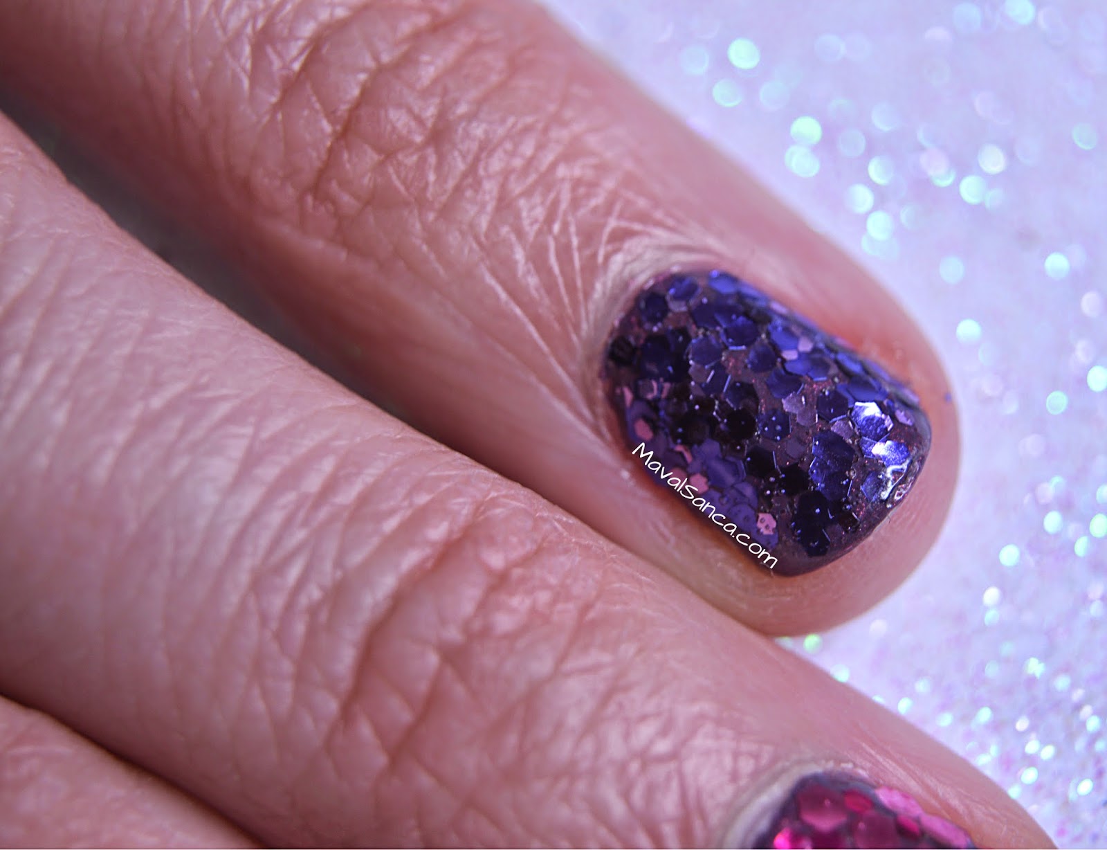En ella están disueltos glitters en varias tamaños y diferentes tonos de morado.It's a nail polish withtransparentbase.