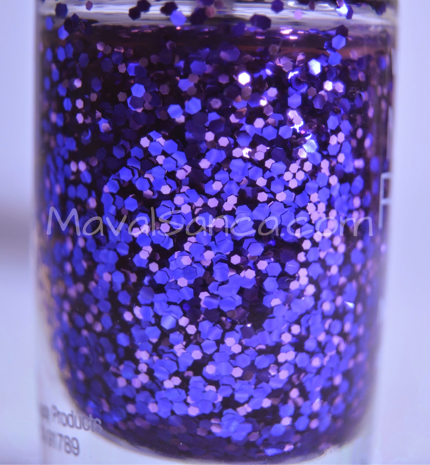 Within are dissolved glitters in various sizes and different shades of purple.