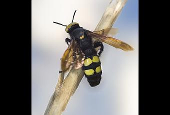 "Megascolia es el avispón europeo de mayor tamaño, hasta 6 cm. de longitud en el caso de hembras, como la de la imagen. Son avispas solitarias parásitas de las larvas del escarabajo rinoceronte Oryctes nasicornis. Los adultos vuelan en zonas cálidas entre los meses de mayo y septiembre y su complejo ciclo biológico se inicia cuando la hembra pica a la larva del rinoceronte europeo para paralizarla y colocar un huevo en su piel externa. Una vez eclosionado el huevo, la larva de Megascolia se irá alimentando de su huésped hasta que sea lo suficientemente grande como para hacer un capullo y esperar a la primavera siguiente, en la que emergerá en estado de adulto"