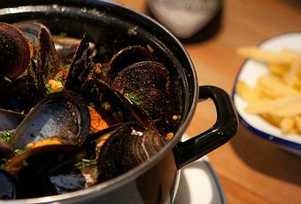 Solo se comen mejillones, sí, pero exquisitos. Son de roca, traídos preferentemente de la ría de Arousa y seleccionados con un tamaño más bien pequeño porque “les va mejor a las recetas y porque si no, no podrías comerte los 30 que van en cada cazuela”, afirma Pablo. Después, eliges entre diferentes salsas internacionales como la mexicana con chipotle, la japonesa con soja, la italiana con tomate y albahaca, la peruana con salsa de ceviche, la francesa con nata o la receta tradicional belga, con apio y cebolla. La untuosidad de los mejillones, sobre todo con la crema belga, pide el crujiente de esas patatas fritas caseras. Haz caso a los camareros, porque están pendientes de recomendarte la más adecuada dentro de una amplia carta de cervezas, para completar la experiencia.