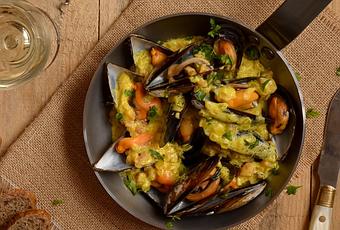 Para abrir los mejillones, yo los pongo en una olla con un dedo de agua, un chorrito de vino blanco, una pizca de sal y un ajo. El caldo que queda una vez abiertos, lo podemos añadir a la salsa y dejarlo reducir con el resto de ingredientes antes de incorporar sobre los mejillones, le aportará un toque estupendo a la salsa y al plato.