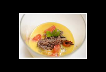 Sólo queda el montaje de los vasitos, repartimos la salsa equitativamente en el fondo de los vasos, colocamos en el centro los mejillones.