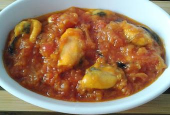mezclamos bien y añadimos los cuerpos de los mejillones. Cocinamos durante unos minutos más.Se pueden servir en sus propias conchas con la salsa por encima.
