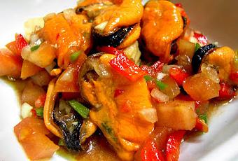 1.- Limpiamos bien las conchas de los mejillones bajo un chorro de agua, también retiramos las barbas estirando con un cuchillo hacia el lado estrecho del mejillón.2.- En una olla ponemos agua, medio vaso de vino blanco y un par de hojas de laurel.3.- Colocamos los mejillones en una tapadera mas pequeña de la olla encima del agua y tapamos dejando una abertura, así sale el vapor y se van haciendo los mejillones.4.- Vamos retirando los que se vayan abriendo, retirando el mejillón de la concha y reservando en un bol.5.- Mientras vamos picando en brunoise las verduras, a nosotros en casa nos gusta trocitos muy pequeños, pero se puede hacer mayor.6.- Aliñamos con un buen vinagre, sal y un aceite de oliva virgen extra a gusto, los mejillones y los pimientos, los tomates y las cebollas.