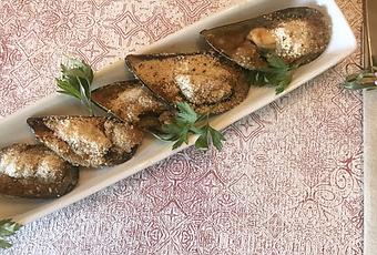 Se preparan los mejillones cubriéndolos con una cucharada de la salsa y con la mezcla del pan rallado y se ponen en la fuente de horno de forma extendida para que todos gratinen.