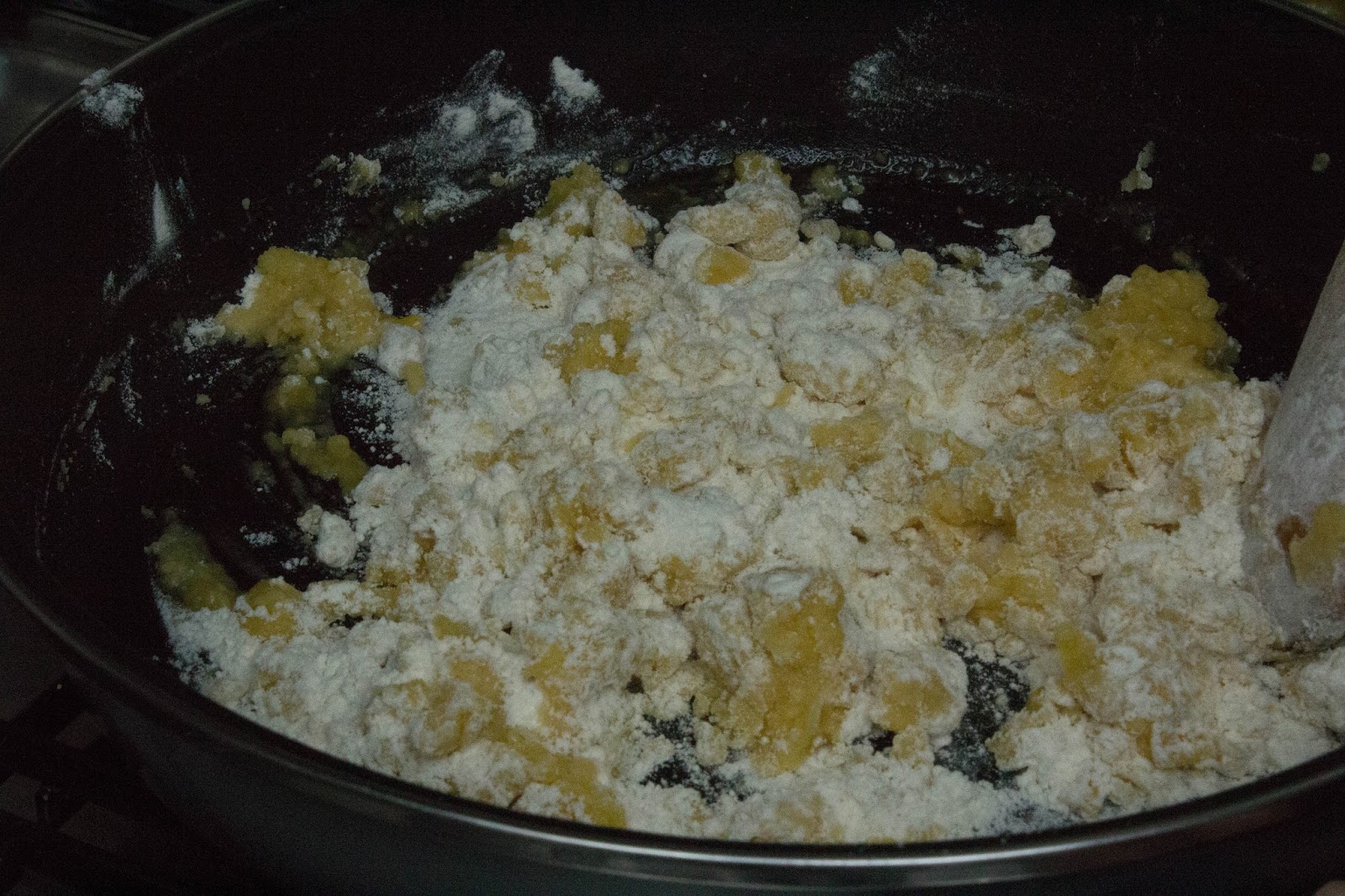 Luego añadir poco a poco la harina, e ir con una cuchara de palo moviéndolo continuamente,