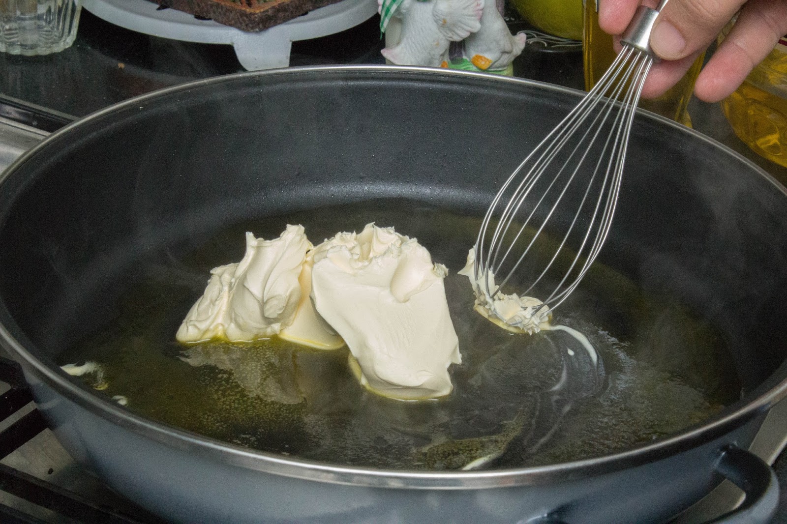 Poner aceite en una sartén hasta que se cubra todo el suelo. Dejar el aceite calentar a fuego medio y cuando esté bien caliente, añadir la margarina. Usar un batidor de varillas para que se vaya ligando con el aceite.