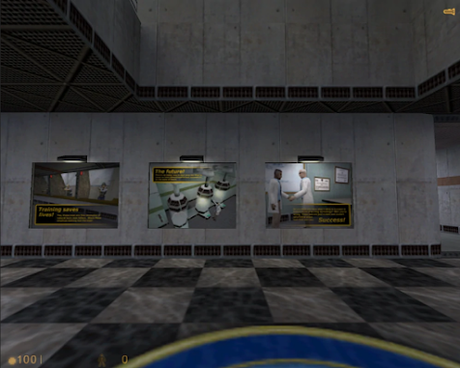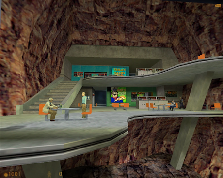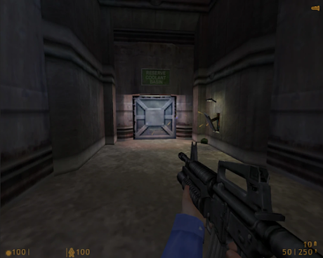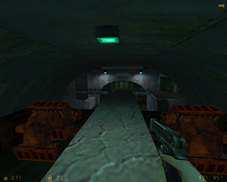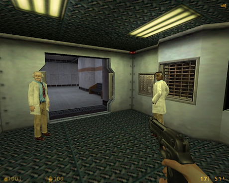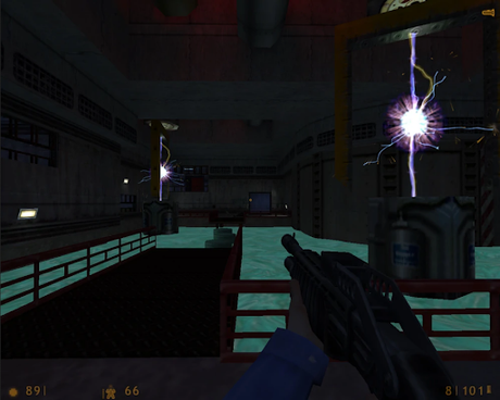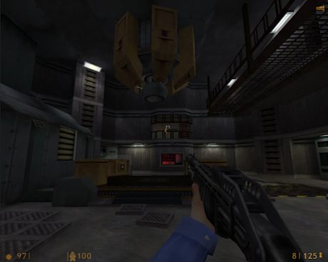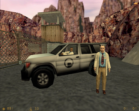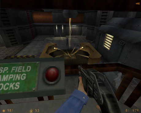 Ya desde el vamos podemos notar que algo no está bien. Los guardias están preocupados, y los científicos tensos. Luego de equiparnos con nuestro chaleco y arma reglamentaria, podemos cumplir con nuestro trabajo propiamente dicho. Uno de los guardias nos encargar ir hacía una elevador cercano con dos científicos dentro, a los que tendremos que escoltar. Una vez que llegamos, uno de los científicos parece de mal humor ya que, según él, nos esperó demasiado tiempo. Pff..., si así empezamos el día... Una vez que ponemos en funcionamiento el elevador (y al ser grande y de carga, éste baja muy despacio), notamos como la corriente eléctrica comienza a fluctuar, hasta el punto en que se corta unos segundos. El científico hace mención al Sector C, y de como siempre llevan a los equipos hasta el límite de funcionamiento y de que seguros ellos son responsables de los fallos en la energía eléctrica. La energía va y vuelve un par de veces. En una de esas veces la alarma comienza a sonar, y el corte es ahora definitivo. También comienzan tamblores cada vez más fuertes, hasta el punto en que se desata el caos. La cascada de resonancias acaba de ocurrir, y todo se va al carajo. Debido a los temblores y explosiones, el elevador cae de forma violenta, matando a los científicos y dejando a Barney inconsciente. Cabe destacar de que toda esta secuencia la vemos en vivo y en directo, sin cinemáticas (un juego actual seguro hubiera hecho toda esa secuencia en una cinemática, quitandole toda la gracia y la tensión generada). Esta es una de mis secuencias favoritas, no solo de la saga, si no también de los videojuegos en general.