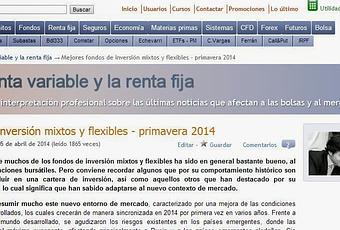 7 de Abril de 2014.Hace unos días escribí un artículo para Rankia en el que hacía una recopilación de los mejores fondos de inversión mixtos y flexibles hasta esta primavera de 2014, los cuales merecen la pena tener en cuenta para construir una cartera de inversión diversificada y bien equilibrada. Algunos son más defensivos y apenas tienen renta variable, mientras que otros son más osados y la bolsa suma una parte importante de la cartera, además de que alguno incluye exposición a materias primas. No te lo pierdas.