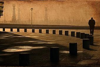Paseante junto al Kursaal de San Sebastián. Fotógrafo: Bisan.Una preciosa instantánea que he encontrado por casualidad. Un melancólico paseante donostierra que rodea el palacio de congresos de San Sebastián. En la foto vemos la transparencia y rugosidad de la piel de los cubos de Moneo, y de forma muy difuminada, el puente de Zurriola que nos conduce al Boulevard y "Lo Viejo".