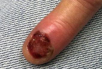 Figura 1. Lecho ungueal expuesto con tejido de granulación rojo carne, edema periungueal, y eritema que se extendía a la parte proximal de la articulación interfalángica proximal en el quinto dedo izquierdo.El paciente refería que 15 meses antes, la uña entera se había avusionado luego de un traumatismo, pero parecía normal antes del incidente. Desde entonces, la uña no volvió a crecer. Algunas veces, el lecho ungueal expuesto presentaba un exudado purulento. El paciente había tratado el área con bacitracina ungüento sin mejoría. Tenía buen estado de salud y no presentaba antecedentes familiares de cánceres cutáneos.