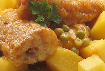 Cubrí con el caldo y añadí las patatas cortadas en cubitos, los guisantes y la hoja de laurel.