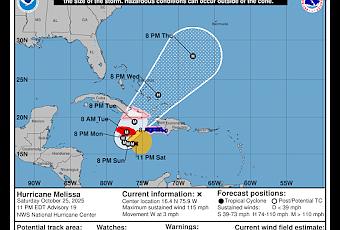 A las 11 de la noche de este sábado, Melissa se conviertió en huracán mayor categoría 3, porque sus vientos máximos sostenidos alcanzaron las 115 millas o 185 kilómetros por hora.