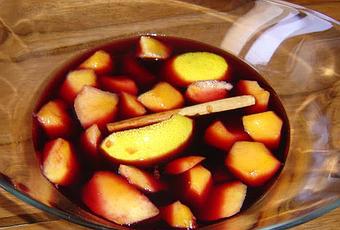 Pelamos los melocotones y los troceamos. Reservamos.Se vierte el vino en una ensaladera y agregamos la ramita de canela, las cortezas de limón y el azúcar.Removemos lentamente el conjunto hasta conseguir la total disolución del azúcar.