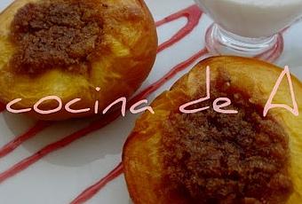 - Rellenar los melocotones y cocerlos al horno precalentado a 180º C unos 25´, hasta que estén tiernos.