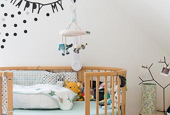 Una habitación luminosa con melodías retro y escandinavas para la habitación de Auguste. Llena de originalidad y buen gusto, una habitación muy sencilla y práctica … donde los colores como el verde menta, amarillo, mostaza o cualquiera de la gama de los colores pastel, combinan perfectamente con el gris o el blanco y negro; dos tonalidades base del estilo nórdico con las que es muy fácil jugar en la decoración infantil.