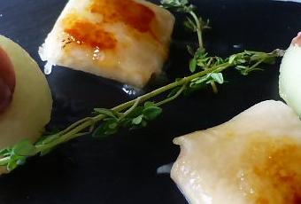 RAVIOLIS CARAMELIZADOS DE MELÓN RELLENOS DE YOGURT Y FOIE Y MELÓN, CECINA Y FOIE.