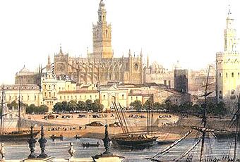 Vista general de Sevilla en 1830, notése el puente sobre barcas sustituído en 1846 por el conocido Puente de Triana.