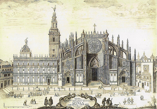 «¿ No ves, no ves la majestuosa torreque aun hasta el cielo su soberbia frentepretende levantar ?... … … … »Montadas. Permite, hermosa amiga, que al comenzar la descripción de la catedral de Sevilla, ponga, a manera de epígrafe, estos versos que me han venido a la memoria y que son de un joven de esta ciudad que se va dando a conocer ventajosamente por su afición a este ramo de literatura, y déjame después hacerte mi compendio. No de otro modo (dice Ceán Bermúdez), que cuando se presenta en el mar un navío de alto bordo empavesado, cuyo palo mayor domina a los de mesana, trinquete y bauprés, con armoniosos grupos de velas, banderas y gallardetes, aparece la catedral de Sevilla desde cierta distancia, enseñoreando su alta torre y pomposo crucero a las naves y capillas que le rodean con mil torrecillas, remates y chapiteles. Pero dejemos a un lado las comparaciones, y vamos, Eloísa mía, a hablar un ratito de la grande obra de Sevilla, sin preámbulos ni exageraciones. Está situada la catedral al mediodía de la ciudad, y se le agregan por el lado del norte el Patio de los Naranjos con sus oficinas y el sagrario nuevo con su sacristía; por el este, la torre o Giralda, la capilla real y la contaduría mayor, y por el sur, la sala capitular, la sacristía mayor, la de los calis y la que llaman el muro. Mucho habrás oído nombrar la Giralda; es obra, según opinión de muchos escritores (a la cual parece se inclina también Ceán Bermúdez, cuyo libro tengo a la vista), de un moro llamado Gener, Hever o cosa muy parecida, por los años de 1000. Está esta gran torre, con su atrevida elevación, casi exenta, pues según observa el escritor que copio, aunque se le arrima la capilla de la Granada, no le sirve de apoyo por ser baja y fábrica de poca consideración. Es de piedra de sillería, en un estado de hombre desde el suelo, y lo restante de ladrillo, siendo todo este primer cuerpo sin disminución, de cuatro frentes iguales de 50 pies de ancho cada uno. A la altura de 87 pies comienzan las axarcaso adornos arabescos, que le dan hermosura y novedad, y más abajo las ventanas o axímenes con arcos de diferentes formas.
