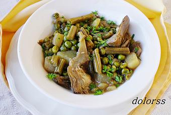 Ingredientes para 4 personas:300 gr. de guisantes300 gr. de judías verdes4 alcachofas300 gr. de patatas1 cebolla2 dientes de ajo100 cc. de vino blanco½ l. de caldo de verduras1c/c de pimentón dulcePimentón picanteSal, pimienta, perejilAceite de oliva virgen extraLavar, quitar las puntas y trocear pequeñas las judías verdes. Pelar, lavar y cortar a dados pequeños las patatas. Quitar las hojas exteriores, cortar las puntas de las alcachofas, partirlas en 4 partes y quitar la pelusilla que pudiera tener.