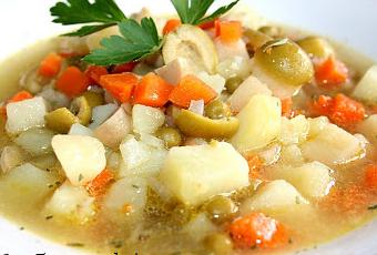 Ingredientes: Patatas Zanahorias Champiñones aceitunas cebolla ajo puerro guisantes judias verdes sal aceite de oliva caldo de verdura (1000 ml) vino blanco (150 ml) 2 hojas de laurel