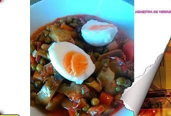 Esta receta la solía hacer mi madre le salia buenísima yo hacia bastante que no la elaboraba.Así que hoy para comer una menestra a la cual le añadido un par de huevos duros.INGREDIENTES:100 gr de havas baby100g de guisantes100 gr de judia tierna50 gr de taquitos de jamón2 tomates rallados1 pastilla de caldo de verduras2 Ajitos1 Cebolla3 alcachofas3 zanahorias1 vaso de vino1 vaso de aguaELABORACIÓN:Pondremos las habas y los guisantes en una cazuela con agua hirviendo y un poco de sal. Cortaremos las judías verdes y las añadiremos. Pelaremos y picaremos las zanahorias y las agregaremos. Dejaremos cocinar Añadiremos un chorro de aceite en una cazuela. Pelaremos y picaremos dos dientes de ajo y los pondremos a dorar. Pelaremos picaremos la cebolleta y el tomate rallado. Sazonaremos y dejaremos pochar. Cuando estén ponchadas, añadiremos el jamón y lo agregaremos. Rehogaremos incorporaremos las verduras cocidas el vaso de vino y un poco del caldo. Dejamos cocinar a fuego suave durante 4-5 minutos. Limpiaremos las alcachofas y pondremos en la olla rápida con un poco de agua. Sazonaremos. Cerramos la olla y cocinamos al vapor (al 1) durante 5 minutos. Escurriremos y partiremos en cuartos. Y las añadiremos por ultimo a la menestra dándole un par de vueltas. Añadimos el huevo partido por encima.