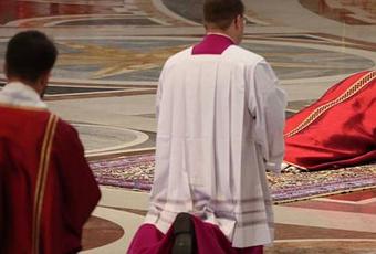 El Santo Padre, postrado en el suelo, oró durante unos minutos junto a todos los fieles arrodillados presentes en la Basílica. Después de ese instante de oración silenciosa, el Pontífice, con la ayuda de los ceremonieros, se puso de nuevo en pie y se procedió a la proclamación de la Palabra.
