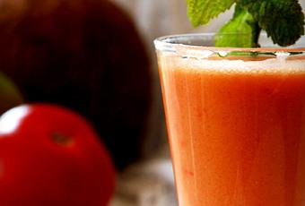 Un coco (usaremos solo el agua)Un mangoUn tomateAceite de oliva, sal y jengibre molidoUna cucharadita de aceite de sésamoUna cucharadita de vinagre de sidra o manzanaUn vaso de agua de mentaTrituramos el mango y el tomate, colamos. Añadimos el resto de los ingredientes y batimos bien, damos la consistencia que queramos añadiendo el agua de menta y de coco. Servimos muy frio y presentamos con una rama de menta fresca.