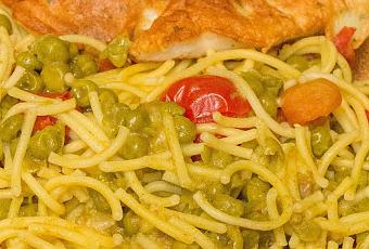 Hoy traigo un menú entero de lo más sano y delicioso. Son unos espaguetis con guisantes y tomates cherry al vino con pollo a la parmesana.