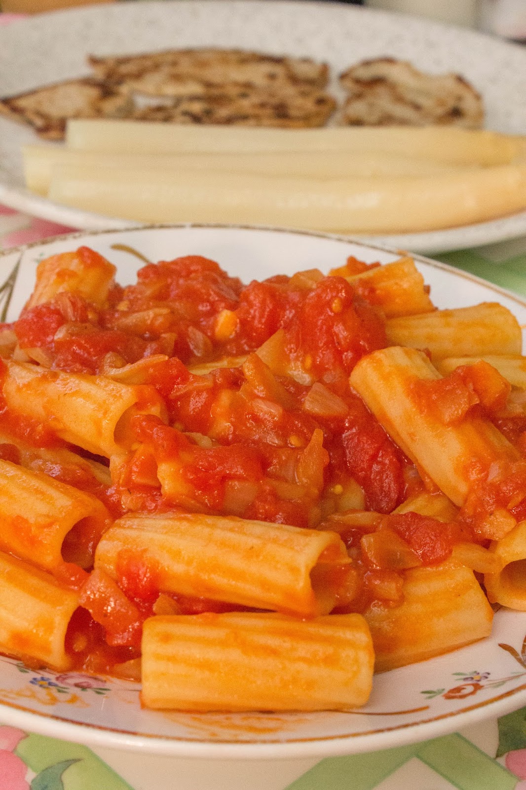 Hoy traigo un menú de macarrones con tomate y de segundo lomo con espárragos. Es un menú completo, sano y equilibrado para comer disfrutando y cuidándose.